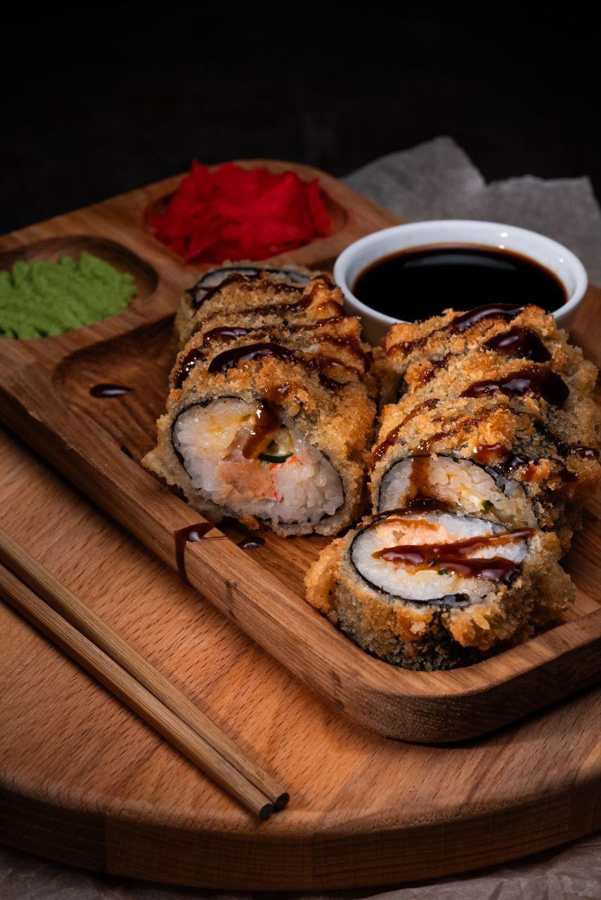 В составе нори, рис, спайси соус, лосось, краб, креветка, огурец, зелёный лук, имбирь, васаби, соевый соус.