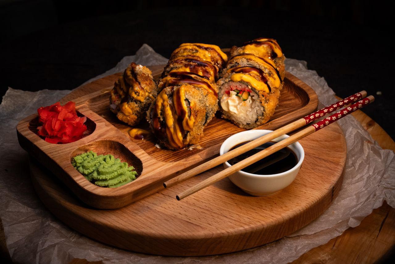 В составе нори, рис, креметта, лосось, креветка, огурец, зелень, икра масаго, имбирь, васаби, соевый соус.