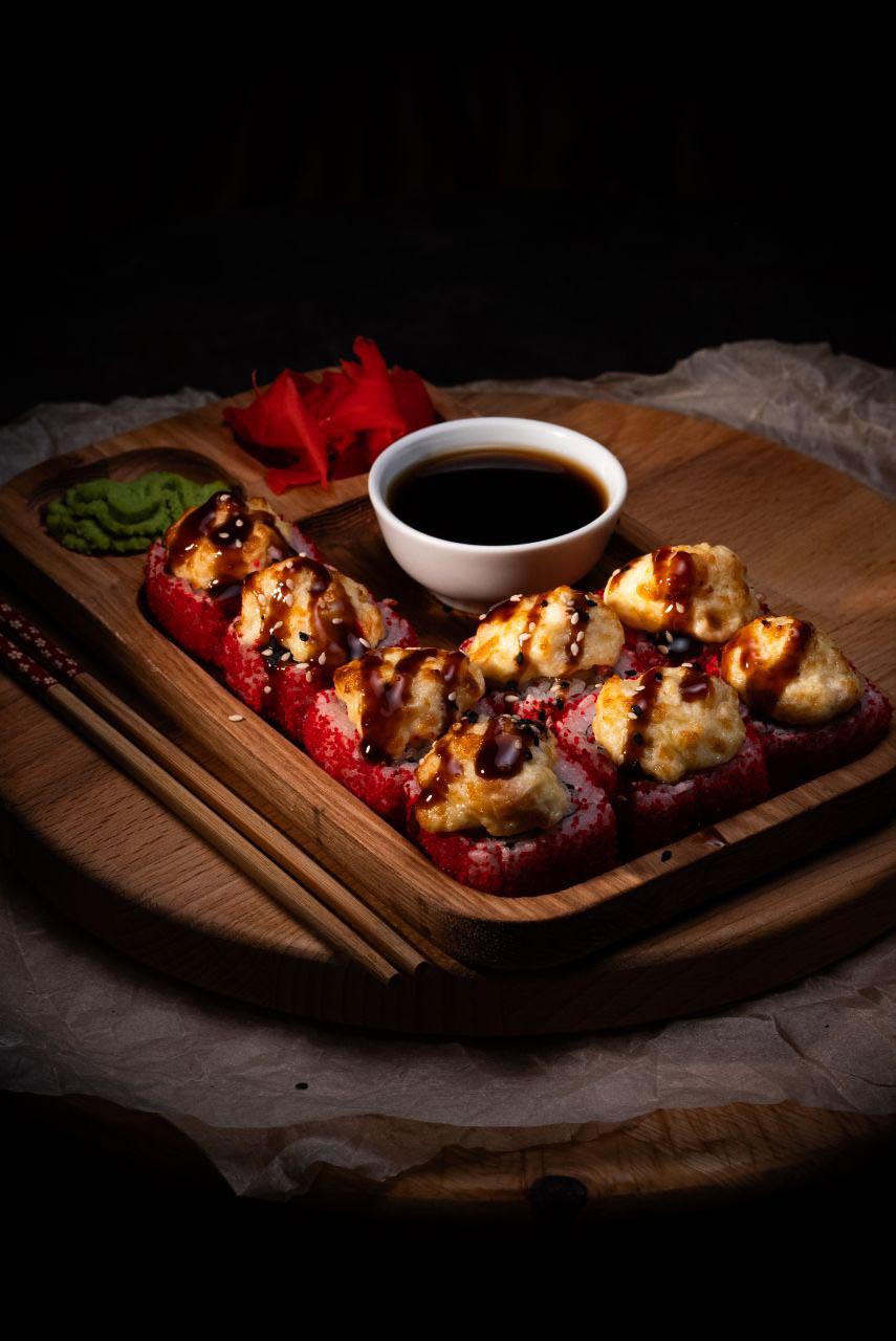 В составе нори, рис, зелёный лук, омлет, помидор, лосось, спайси соус, имбирь, васаби, соевый соус.
