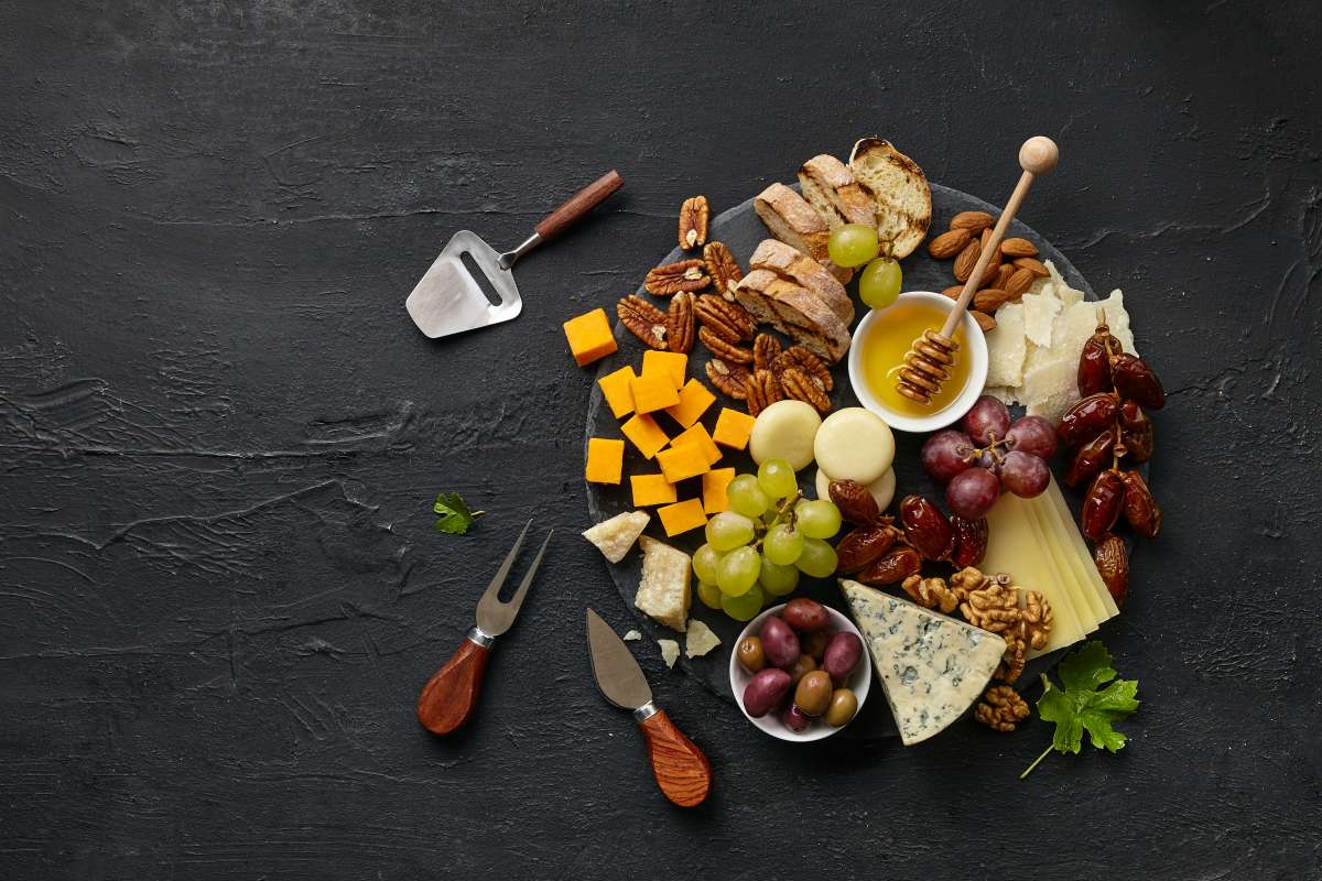 Маасдам, дорблю, пармезан, сулугуни и голландский сыр. Подаётся с мёдом и орехами.